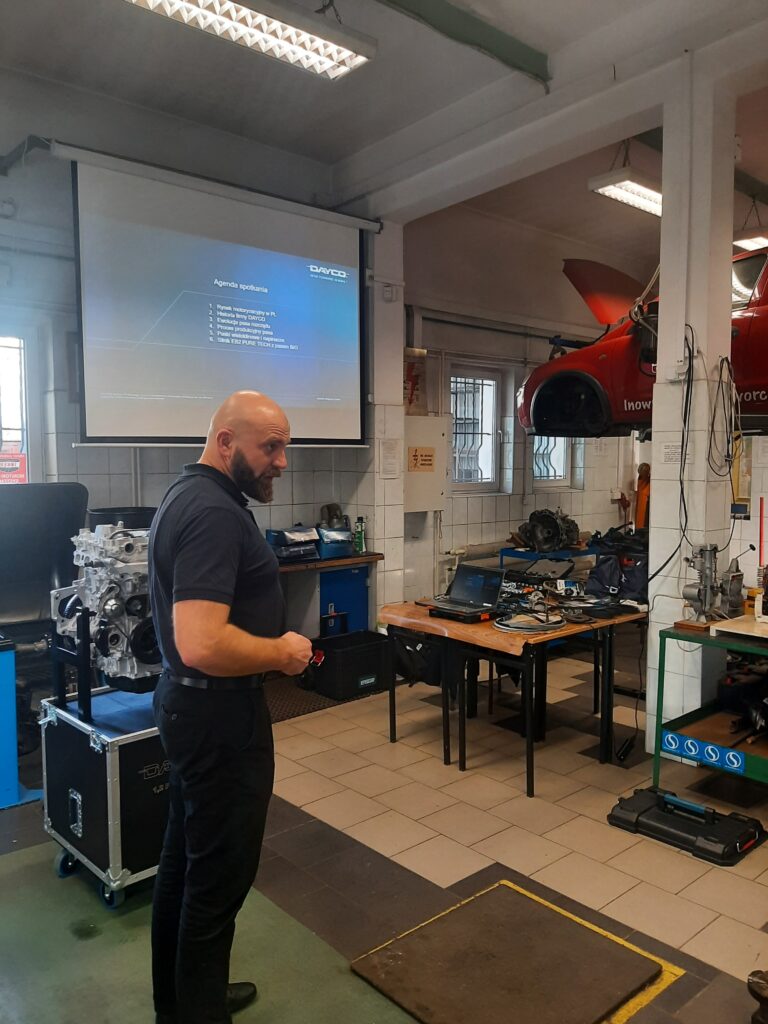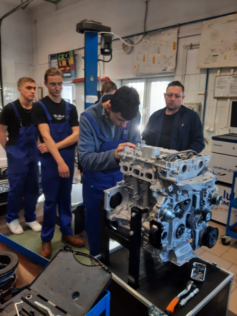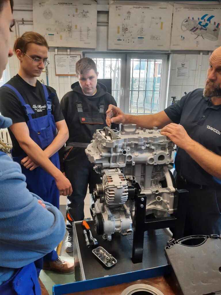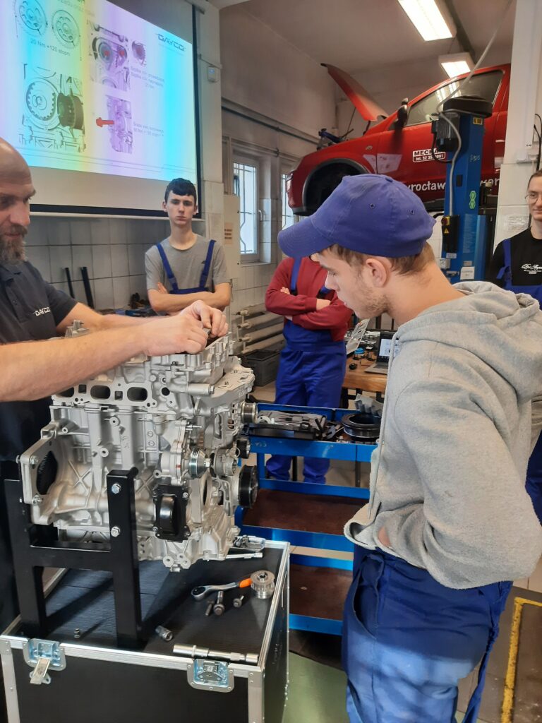 Szkolenie, w którym uczestniczyli uczniowie z klasy IIIa Szkoły Branżowej I stopnia w zawodzie mechanik i elektromechanik samochodowy składało się z dwóch części. W trakcie pierwszej części uczniowie zapoznali się z rozwojem i ewolucją napędów rozrządu oraz historią i ofertą firmy DAYCO. Natomiast w drugiej praktycznej części uczestnicy mogli samodzielnie przeprowadzić wymianę oraz regulację paska napędu rozrządu przy wykorzystaniu modelu stanowiącego osprzęt serwisowy firmy DAYCO - Silnik EB2 1.2 PURE TECH z pasem BIO.