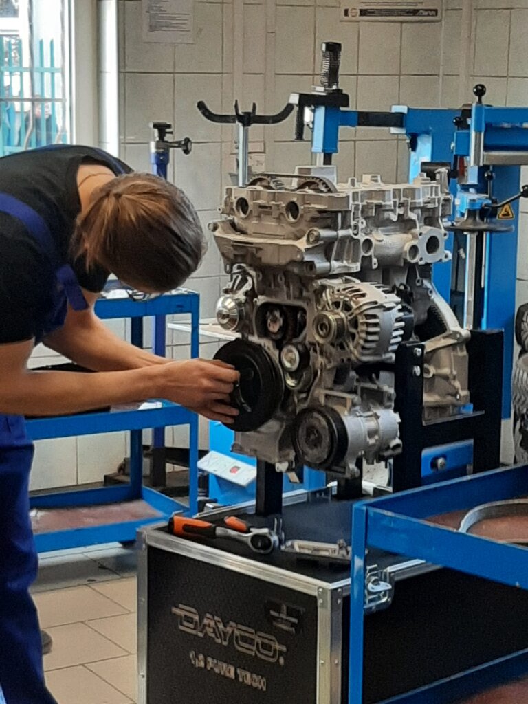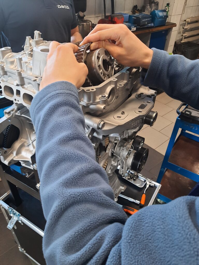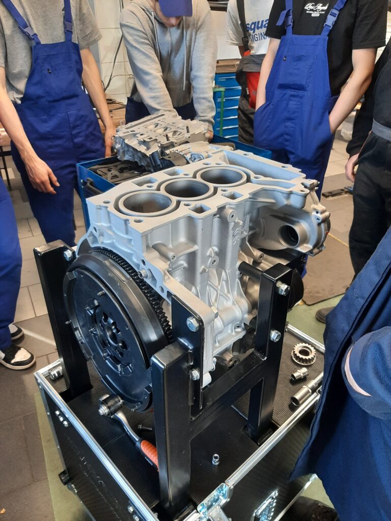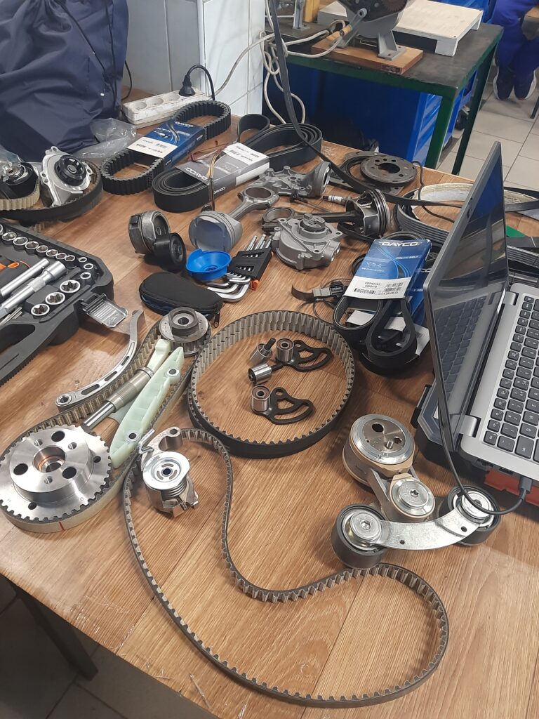 Szkolenie, w którym uczestniczyli uczniowie z klasy IIIa Szkoły Branżowej I stopnia w zawodzie mechanik i elektromechanik samochodowy składało się z dwóch części. W trakcie pierwszej części uczniowie zapoznali się z rozwojem i ewolucją napędów rozrządu oraz historią i ofertą firmy DAYCO. Natomiast w drugiej praktycznej części uczestnicy mogli samodzielnie przeprowadzić wymianę oraz regulację paska napędu rozrządu przy wykorzystaniu modelu stanowiącego osprzęt serwisowy firmy DAYCO - Silnik EB2 1.2 PURE TECH z pasem BIO.